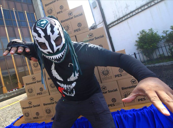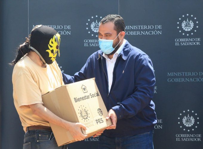En esta ocasión el ministro de Gobernación, Mario Durán, entregó 102 paquetes alimentarios a los miembros del gremio de luchadores salvadoreños que han resultado afectados económicamente ante la emergencia por COVID-19.