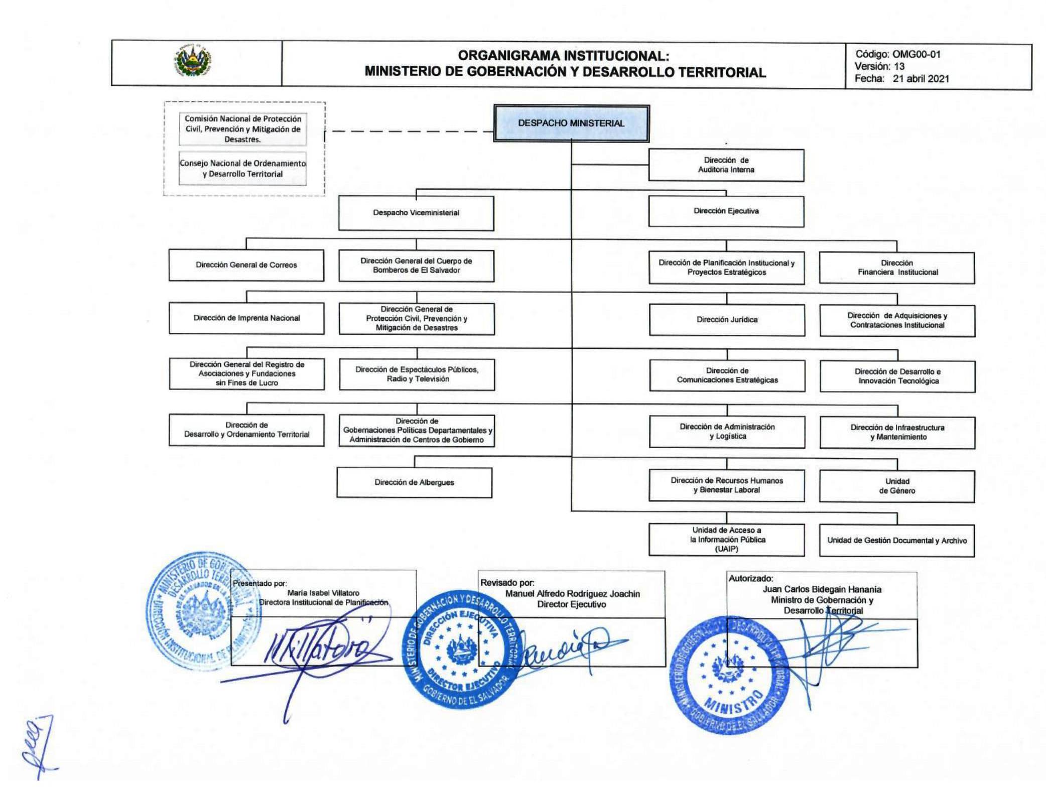 Finalmente por Decreto No 1 del de junio de 2014, publicado en el D. O. No. 100 se reforma el Reglamento interno del Órgano Ejecutivo y se modifica el nombre a Ministerio de Gobernación y Desarrollo Territorial, incorporando nuevas competencias las cuales se encuentran descritas en el Decreto No 1, Art. 34 en referencia.