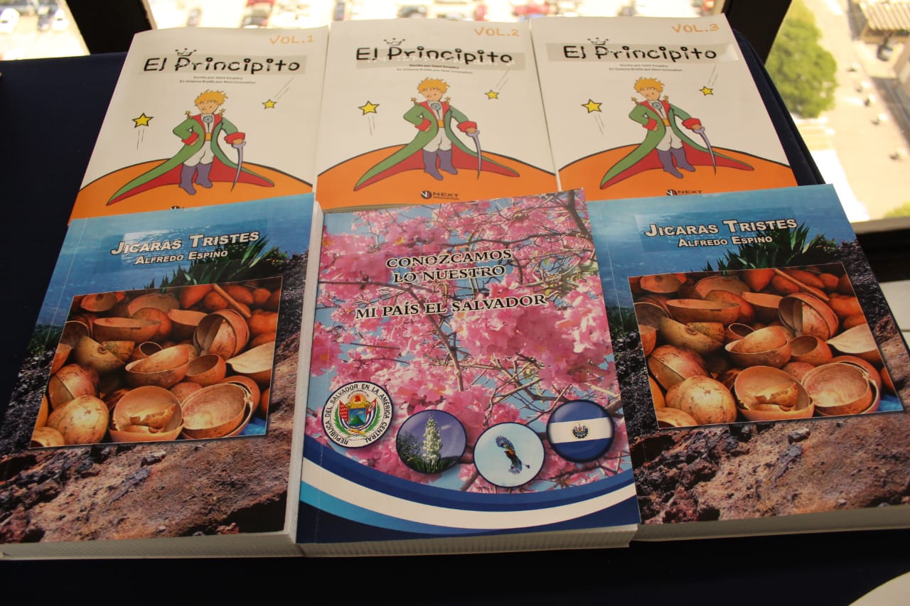 El donativo consistió en la entrega de la obra “Jícaras Tristes” de Alfredo Espino, y del libro “Conozcamos lo nuestro, mi país El Salvador” para el Centro Escolar de Ciegos Eugenia de Dueñas; para la Biblioteca Cuscatlán y para la Biblioteca Nacional.
